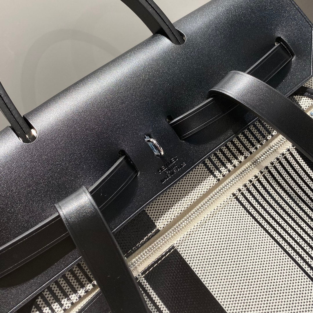 HERBAG A DOS ZIP RETOURNE BACKPACK 29 IN OFF-WHITE MIX BLACK CANVAS AND CALFSKIN